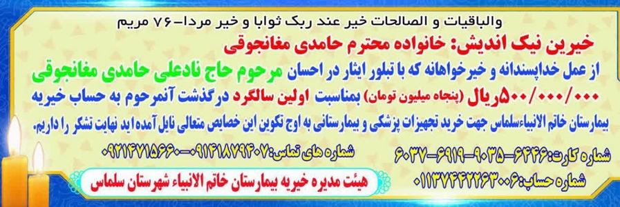 به گزارش روابط عمومی شبکه بهداشت و درمان سلماس، با نهایت احترام و قدردانی، بدین‌وسیله از خیرین محترم خانواده حامدی مغانجوقی که بمناسبت اولین سالگرد درگذشت مرحوم حاج نادعلی حامدی مغانجوقی، مبلغ پانصد میلیون ریال (۵۰ میلیون تومان) را به‌منظور خیرات و احسان و جهت خرید لوازم و تجهیزات پزشکی و بیمارستانی به حساب خیریه بیمارستان خاتم‌الانبیاء سلماس واریز نمودند، صمیمانه تشکر و قدردانی می‌نماییم.