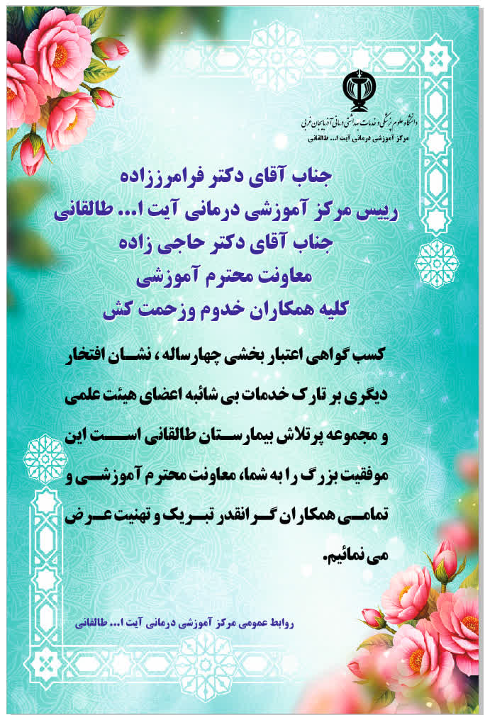 به استناد رای صادره در بند 1 مصوبات بیست و سومین جلسه کمیسیون ملی اعتباربخشی دانشگاه ها و دانشکده های علوم پزشکی مورخ بیست و هفتم مرداد سال جاری حکم اعتباربخشی آموزشی مرکز آموزشی درمانی آیت ا... طالقانی به صورت تایید صلاحیت 4 ساله ابلاغ می گردد.