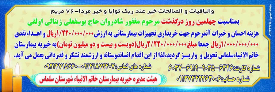 با نهایت احترام و قدردانی، بمناسبت اولین سالگرد درگذشت مرحوم حاج یوسفعلی زینالی اولقی، مبلغ دو میلیارد و دویست و بیست میلیون ریال (222 میلیون تومان) را به‌منظور خیرات و احسان و جهت خرید لوازم و تجهیزات پزشکی و بیمارستانی به حساب خیریه بیمارستان خاتم‌الانبیاء سلماس واریز شد.