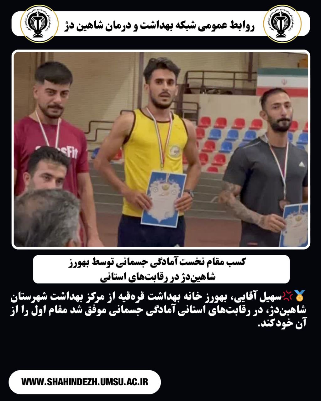 سهیل آقایی بهورز خانه بهداشت قره قیه از مرکز بهداشت شهرستان شاهین دژ ، در رقابت های استانی آمادگی جسمانی موفق شد مقام اول را از آن خود کند.