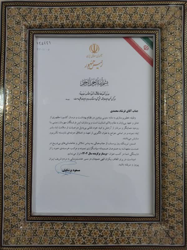 در مراسمی که به مناسبت گرامی‌داشت روز پرستار و با حضور رئیس‌جمهور برگزار شد، دکتر فرشاد محمدی مدیر امور پرستاری دانشگاه علوم پزشکی آذربایجان غربی موفق به کسب عنوان «پرستار برگزیده سال ۱۴۰۴» شد و لوح تقدیر را از دکتر پزشکیان رئیس جمهور محترم دریافت کرد .