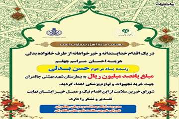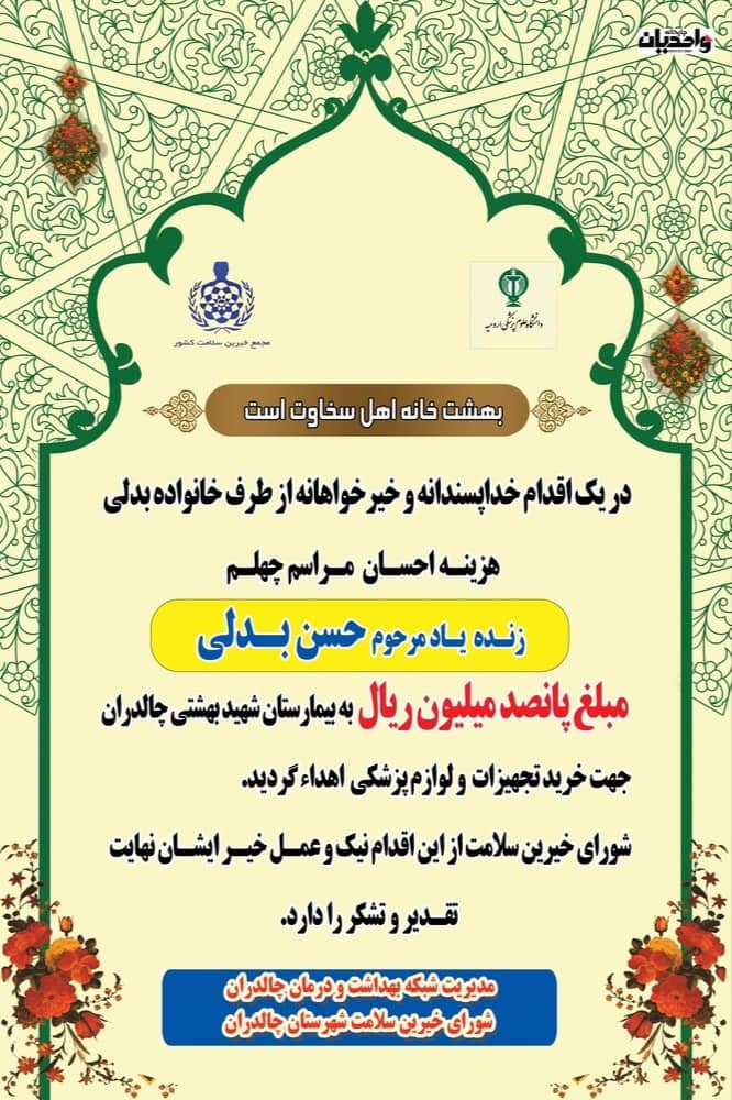 خانواده محترم بدلی هزینه احسان چهلم زنده یاد مرحوم حسن بدلی را صرف خرید تجهیزات و لوازم پزشکی به بیمارستان شهید بهشتی چالدران کردند.